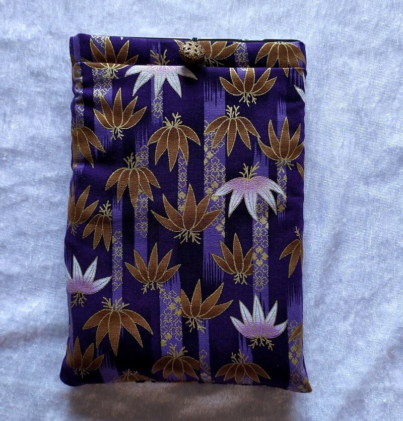 Etui pour liseuse ou tablette en coton à motifs Japonais ( Fleurs de lotus roses et dorées sur fond violet). L’accessoire est doublé (lin violet uni) et rembourré d’une fine couche de ouate. L’étui se ferme à l’aide d’un élastique et d’un bouton sur le devant.