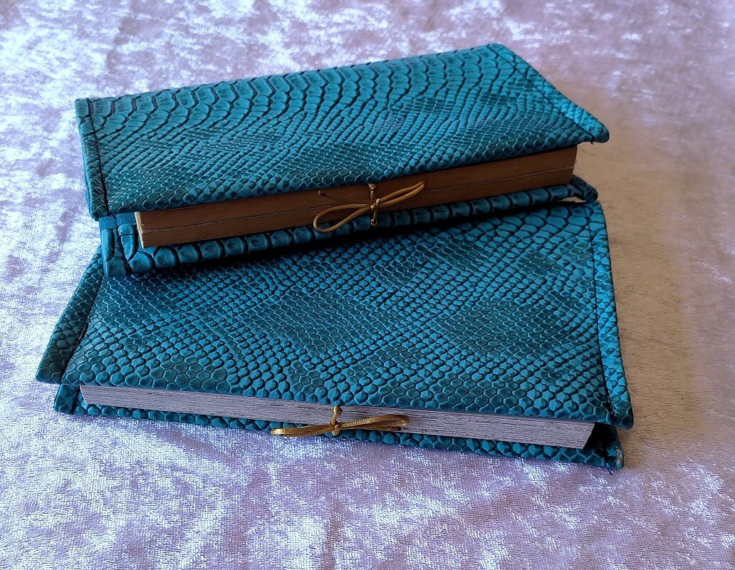 Protège livre de poche en simili cuir. L’article est doublé d’un coton fin, se ferme par le biais d’une fine queue de ras dorée.