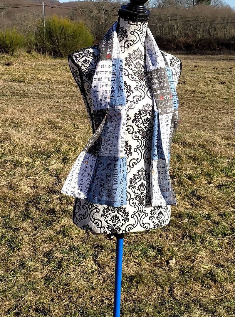 Foulard long fantaisie en coton léger patchwork à motifs d’écritures coréennes (Hangeul) . Le foulard est composé de 3 tissus de couleur différentes.