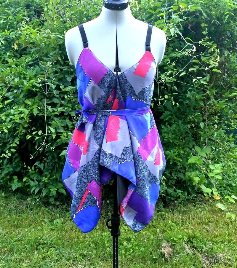 Joli débardeur asymétrique en satin réversible, face 1 satin Japonais coloré, face 2 satin uni noir. Bretelles élastiques noires (les bretelles sont amovibles). Coupe ample, peut être ajusté à l’aide d’une ceinture sous la poitrine ou au niveau de la taille. La matière est légère et fluide. Vendu avec la ceinture.