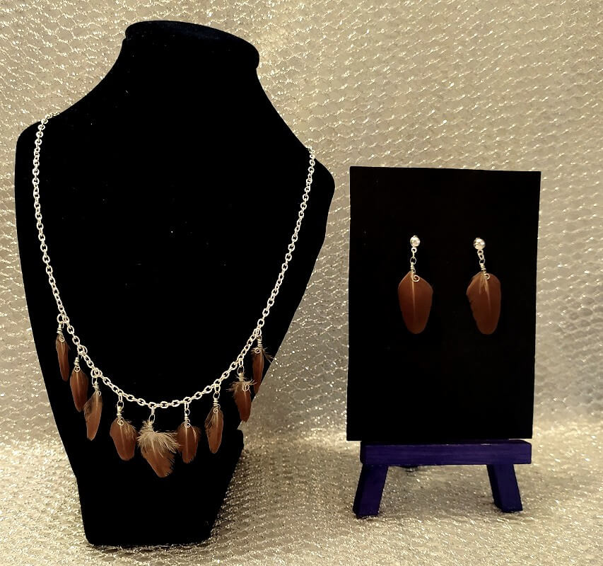 Très belle parure plumes de paon (collier et boucles d’oreilles). Fermoir laiton. Le collier est composé d’une fine chaine argenté, de 9 petites plumes de paon couleur marron glacé. Les clous d’oreilles sont composés d’un support fin argenté, d’une plume de paon marron glacé.