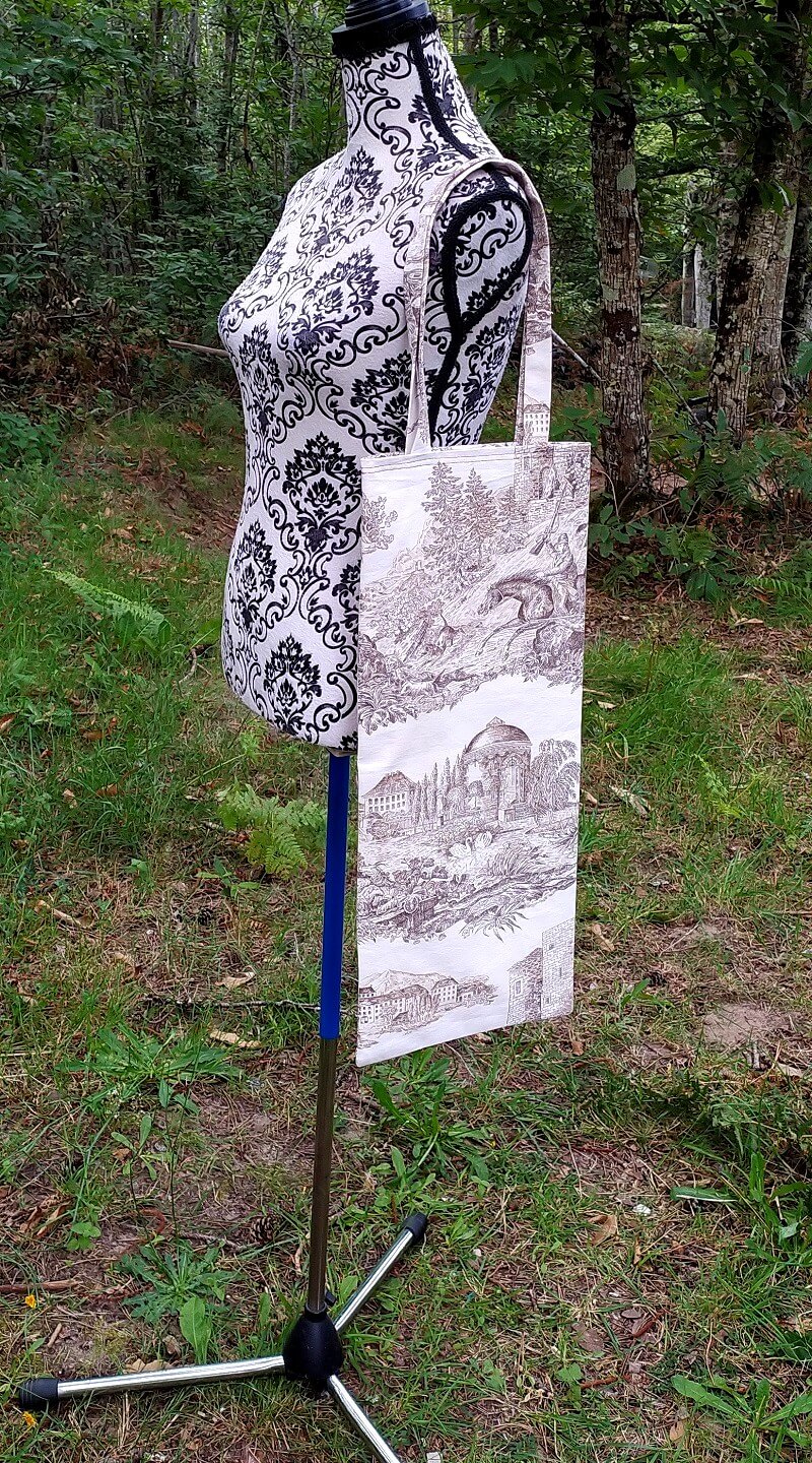 Sac à pain long épais anse longue, en toile de Jouy beige à motifs de paysages marron ,doublure coton blanc (certifié Oeko-tex).